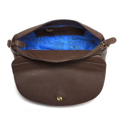 Inner - custom London print blue suede fabric lining, with cowhide leather trims. The leather flap open on a magnetic press stud and underneath there is a zipped closure for extra security. Inside the bag there is a zipped pocket, two additional pockets for a mobile phone etc. and a leather key fob to attach keys as well as a separate pen holder.